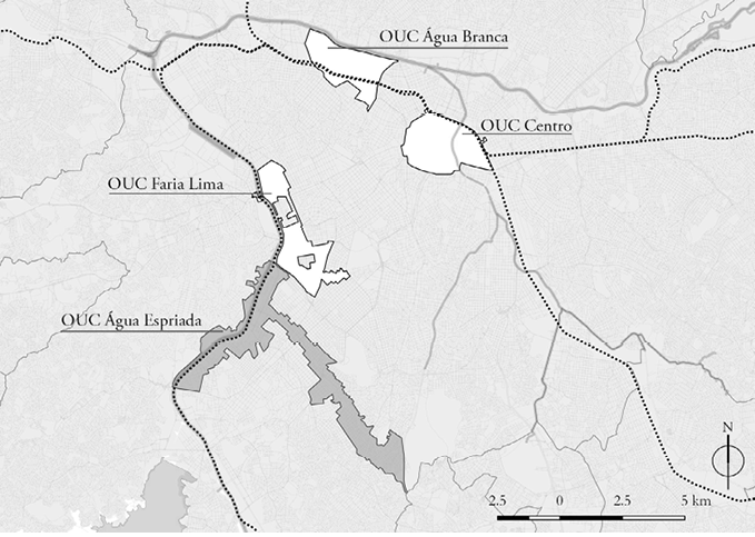 Existem hoje na cidade de São Paulo cinco Operações Urbanas Consorciadas (ouc) vigentes – Água Branca, Centro, Faria Lima, Água Espraiada e Bairros do Tamanduateí (ver figura 2). Cada uma delas tem legislação específica e prevê a flexibilização dos limites estabelecidos pela Lei de Zoneamento, mediante o pagamento de uma contrapartida financeira. Estudos sobre esse instrumento indicam que a Operação Urbana Água Espraiada, por se mostrar mais alinhada com os interesses do capital imobiliário, apresentou maior arrecadação em comparação com as demais.