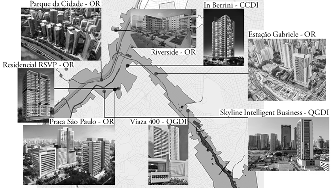 Mas é sobretudo nos espaços mais valorizados e de reestruturação imobiliária, anteriormente ocupados por áreas industriais, onde se verifica maior concentração de empreendimentos dessas empreiteiras. Reconhecidos pelo Plano Diretor Estratégico de São Paulo de 2014 como Macroárea de Estruturação Metropolitana (mem), esses espaços industriais, privilegiados pela concentração de infraestruturas, construídas originalmente para a circulação da produção industrial, passam a ser disputados pelos maiores grupos de incorporação e pelas grandes empreiteiras. A intensificação do uso do solo nessas áreas foi estimulada desde os anos 1990, em parte, por meio de instrumentos urbanísticos como as Operações Urbanas Consorciadas. Nesse tipo de operação, o município estabelece uma área de intervenção onde um adensamento construtivo pode ser alcançado mediante o pagamento de uma contrapartida por parte do setor privado. O dinheiro arrecadado poderia ser investido, então, na execução de obras de infraestrutura e equipamentos públicos na região delimitada pela Operação.