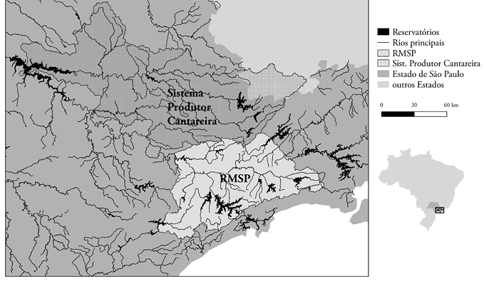Assim, pode-se reconhecer certo fortalecimento institucional para o desenvolvimento urbano-regional a partir da Política Nacional de Saneamento Básico (2007), da Política Nacional de Mobilidade Urbana (2012) e da Política Nacional de Resíduos Sólidos (2010). Tais instrumentos, porém, acentuaram as estratégias setoriais de governança, mantendo desconectadas e por vezes contraditórias as políticas que impactam o espaço metropolitano. Nem mesmo o Estatuto da Metrópole (Lei Federal nº 13.089/2015) logrou até agora grandes avanços na governança interfederativa para as funções públicas de interesse comum, inclusive produção de água e proteção ambiental dos sistemas produtores. As estratégias de apropriação dos recursos hídricos, imbricadas ao processo de industrialização e metropolização de São Paulo, transbordam seus limites institucionais e da bacia hidrográfica que a acolhe. O Sistema Integrado de Abastecimento de Água, operado pela Companhia de Saneamento Básico de São Paulo (Sabesp), atende 31 (trinta e um) municípios metropolitanos e abrange 8 (oito) sistemas produtores de água dentre eles o Sistema Cantareira, com capacidade de fornecimento de quase 70 m³/s (sabesp, 2015b), mais de 30 m³/s provenientes de bacias hidrográficas adjacentes, revelando uma escala de relação funcional e dependência por recursos hídricos (ver Figura 1). Tal dependência gerou um novo arranjo de gestão regional – a Macrometrópole Hídrica – estratégia para garantir o uso múltiplo de recursos hídricos na região e propor um conjunto de alternativas de novos mananciais na Macrometrópole Paulista.