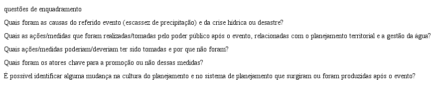 As entrevistas foram semiestruturadas, com base nas cinco questões do enquadramento que balizaram a pesquisa (tabela 1). Previamente às questões foram apresentadas duas premissas para manifestação do entrevistado: a primeira delas a de que a rmsp enfrentou em 2014 um período de seca, que pode ser caracterizado como extremo e atípico e, a segunda, a de que houve uma crise hídrica, associada a esse evento, que implicou questões voltadas ao abastecimento de água. Esta etapa teve por objetivo alinhar o entendimento do entrevistador e entrevistado sobre o tema e sobre o recorte temporal proposto. Em seguida, foram feitas diretamente aos entrevistados as questões norteadoras, relacionadas às causas do evento climático extremo e da crise hídrica e também às medidas adotadas para seu enfrentamento. Ao final das entrevistas foi cedido espaço aos entrevistados para manifestação livre, apontando questões que julgassem importantes, frente aos objetivos da pesquisa.