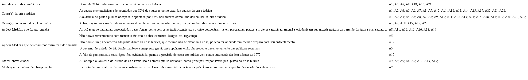 Com base na primeira questão de enquadramento relativa à data de início da crise hídrica da rmsp, não há unanimidade entre as fontes, mas destaca-se, em 32% dos documentos, o ano de 2014 como seu início. Com relação às causas da crise, 95% das fontes citam que houve uma gestão inadequada e 80% combinam a gestão inadequada a outros fatores (alto índice populacional; alto consumo; baixos índices pluviométricos). A causa da escassez de precipitação não é definida por 50% das fontes, 27% definem como perturbações ecossistêmicas e destacam como exemplos: retirada da cobertura vegetal; intensa urbanização; ocupação desordenada; práticas agrícolas inadequadas; desmatamento e poluição.