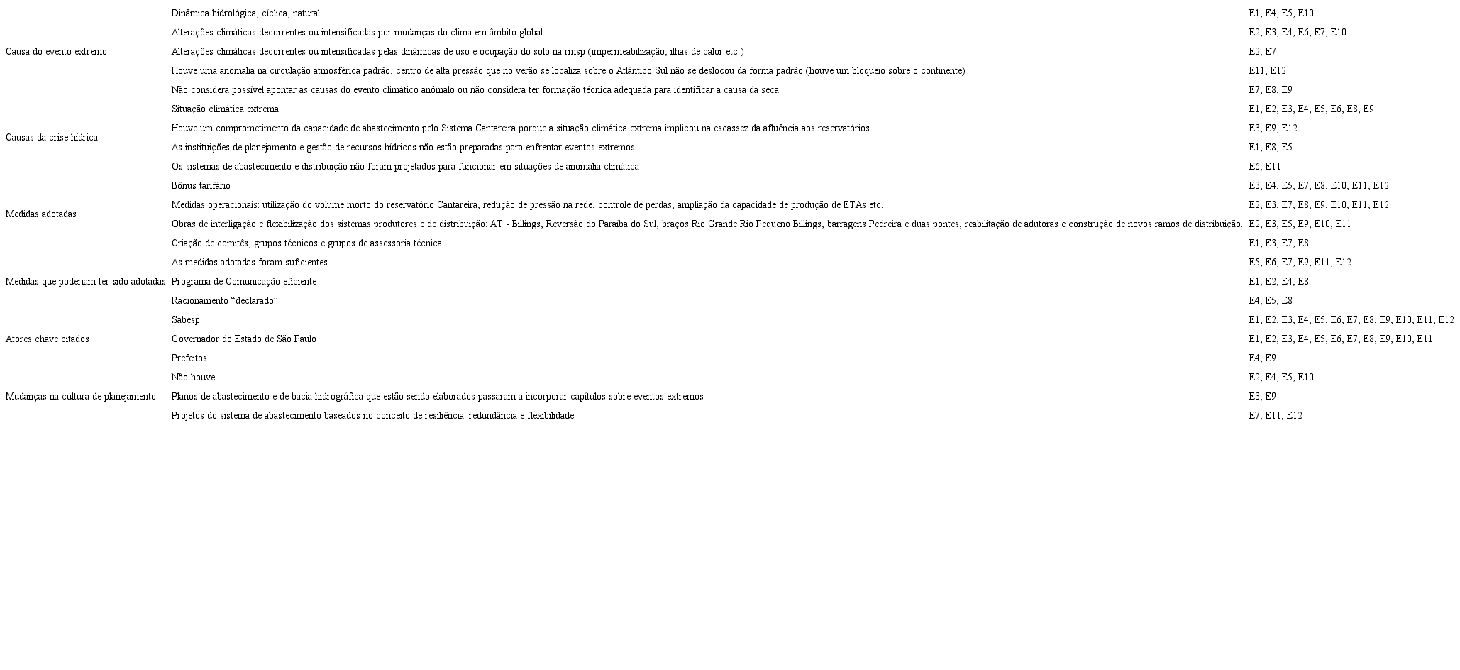 No que se refere às premissas apresentadas, apenas um dos entrevistados fez considerações em desacordo, ao refletir que não seria apropriado utilizar a expressão “crise hídrica”, pois compreende que as medidas adotadas conseguiram evitar as consequências danosas do fenômeno climático. Esta pareceu ser uma ponderação circunstancial e não uma posição institucional, pois outros atores da mesma esfera governamental não questionaram a premissa apresentada e nomearam o período estudado, em suas falas, como um período de crise.