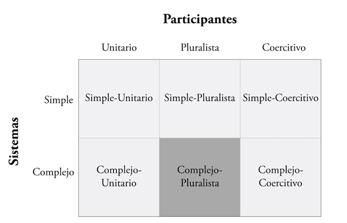 A fin de identificar la metodología de mayor pertinencia para el estudio de las playas turísticas, se utilizó la Matriz Contexto-Problema expuesta por Jackson (2003). De acuerdo con dicha matriz, los problemas pueden ser simples o complejos, de participación unitaria, pluralista o coercitiva (Figura 1). Las playas, al ser compuestas por variedad de visiones, constituyen un sistema pluralista; y dada la diversidad de relaciones presentes en la interacción ambiente-sociedad, son un sistema complejo. En consecuencia, los sistemas de playa con fines turísticos pueden entenderse como sistemas complejo-pluralistas.