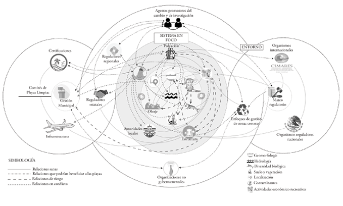 La Figura 2 muestra, desde el centro hacia afuera, el medio físico que soporta la actividad turística; enseguida se indican los elementos que conforman el sistema en foco, determinado por las actividades que influyen directamente en la problemática de Puerto Escondido; por último, se representa el entorno que influye en la problemática. Los elementos que conforman cada uno de los componentes antes descritos interactúan entre sí, generando diversos tipos de relaciones: i) relaciones sanas, esto es, aquellas referidas a interacciones que no están afectando la gestión de playas de Puerto Escondido; ii) relaciones que podrían beneficiar a las playas, vale decir, aquellas que deben ser mejoradas para fortalecer la gestión de dichos espacios; iii) relaciones en riesgo, que consideran aquellos vínculos, especialmente entre personas y el entorno, que podrían afectar la vinculación del sistema ecológico con el sistema humano; y por último, iv) relaciones en conflicto, es decir, aquellas que afectan la naturaleza por la actividad antrópica. Se puede citar como principales conflictos identificados en Puerto Escondido la generación de contaminantes y su falta de tratamiento; la ausencia de un ordenamiento tanto de estructura como de actividades humanas; en algunas playas, la limitada participación de la comunidad y la inexistencia de una adecuada vinculación entre la comunidad y las autoridades gubernamentales relacionadas con la gestión de playas.