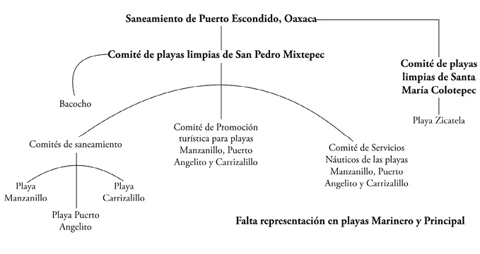 El esclarecimiento de las relaciones se hizo mediante la participación de las gerencias operativas de los Comités de Playas Limpias (cpl) que conforman Puerto Escondido, en este caso cpl de San Pedro Mixtepec (cplspm) y cpl de Santa María Colotepec (cplsmc). La participación de los cpl en este proceso aclaró la participación social en acciones de gestión de playas. En Puerto Escondido, la sociedad civil ha desarrollado acciones orientadas a mejorar la relación entre el sistema ecológico y el aprovechamiento humano.