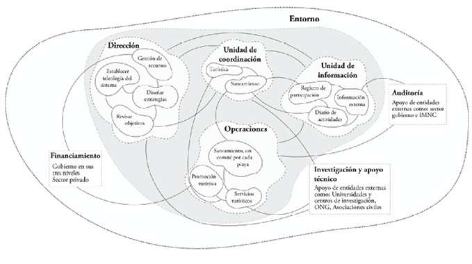 Además de estos sistemas centrales, el modelo conceptual muestra unidades del entorno próximo que pueden fortalecer la gestión de las playas de Puerto Escondido. En este sentido, se consideró la vinculación con unidades que permitan obtener recursos, capacitación e información especializada. Estas unidades son Financiamiento, Investigación y Apoyo Técnico, así como Auditoría Externa. Esta última resulta de gran importancia, pues las playas Zicatela y Bacocho cuentan con certificación como playas limpias y constantemente deben ser monitoreadas para mantener dicho nombramiento. Además, esta distinción obliga a que se mantengan en vigilancia las zonas de playa y cuencas adyacentes.