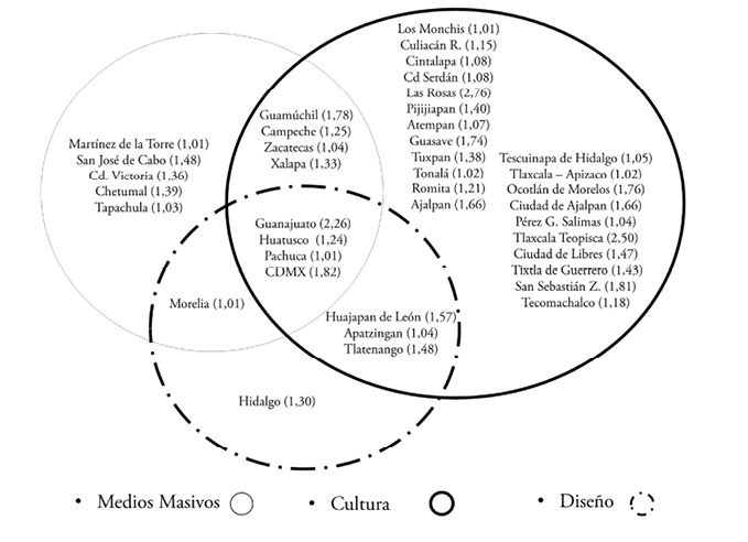 elaboración propia con información del laboratorio de microdatos de inegi, noviembre de 2018, proyecto lm-727Las 43 ciudades con sobresalientes concentraciones relativas (o especialización) de sic-simbólicos no tienen el mismo perfil productivo de esos servicios (Figura 1). Cada una se especializa en un subgrupo o bien una combinación particular de actividades según los tres grupos de sic-simbólicos (medios masivos, arte y cultura, y diseño). La Figura 1 ilustra el tipo, la combinación de estas actividades y el valor del cl por ciudad. Hay dos rasgos importantes de destacar.