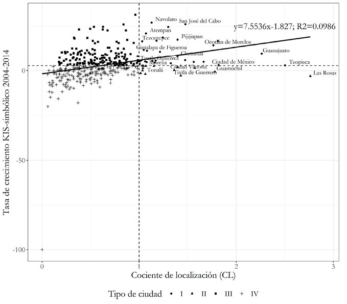 elaboración propia con información del laboratorio de microdatos de inegi, noviembre de 2018, proyecto lm-727las variaciones en la tasa de crecimiento de los sic-simbólicos (2004-2014) se encuentran, aunque de forma reducida r2 ajustada=9,8%, positivamente asociadas con los niveles de especialización en ese mismo tipo de servicios a través de las ciudades del sun. promedio del incremento porcentual (i) en el sun=2,74