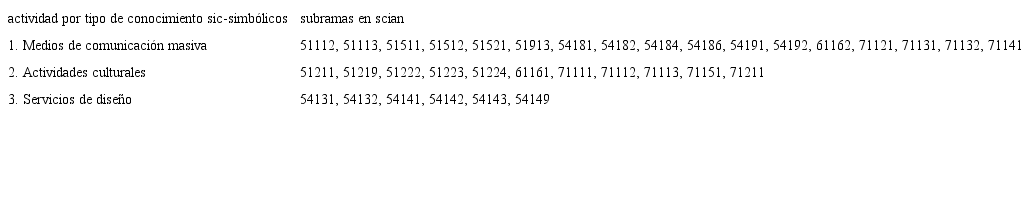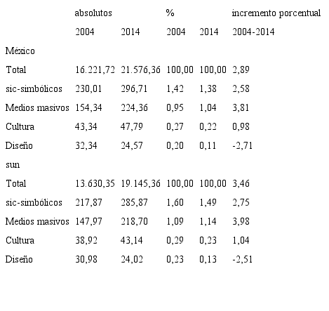 En 2014, el po en México fue de 21,5 millones. Los sic-simbólicos tienen una reducida participación dentro de la economía nacional, pues representaron únicamente 1,38% del po nacional. El sun concentraba 88,78% del po nacional. Dentro de la estructura económica del sun, los sic-simbólicos también representaron una reducida proporción, ya que únicamente 1,49% se empleaba en este tipo de servicios. La estructura productiva de estos servicios en el ámbito urbano del país se distribuye de la siguiente forma: 76,51% en medios masivos; 15,09% en arte y cultura; y 8,04% en diseño. Estas son las proporciones de empleo formal en servicios dedicados a la producción y creación de imágenes, significados, deseos, atributos estéticos, diseños, marcas y símbolos en México y su sistema urbano. Con estos breves datos descriptivos es posible tener una idea de la importancia relativa de los sic-simbólicos en el ámbito urbano de México (Tabla 2).