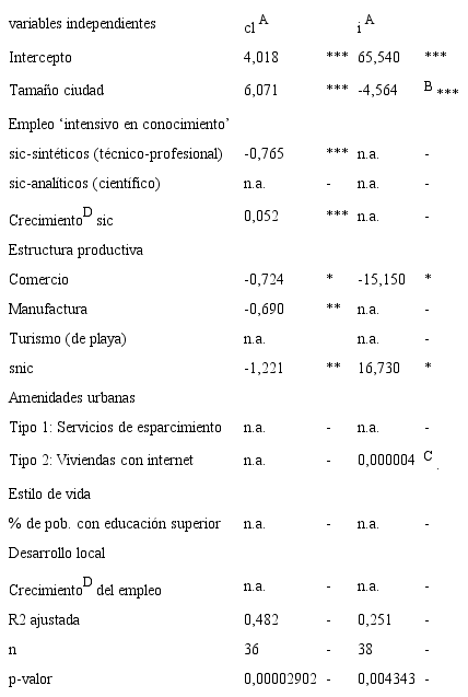 Pregunta 3) ¿Qué factores señalados por la literatura están determinando la localización y la dinámica sobresaliente de los sic-simbólicos? Las variables señaladas por la literatura que determinarían la localización de los sic-simbólicos a través de un conjunto de ciudades explican casi 50% (R2 ajustada=48,17%) de las variaciones en el cl de esos mismos servicios en el conjunto de las ciudades Tipo I. Sin embargo, no todas esas variables son significativas y su relación con el cl de los sic-simbólicos no es unidireccional (Tabla 3).