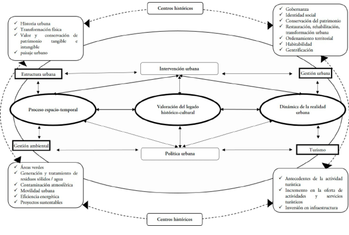 De acuerdo con De las Rivas y Vázquez (2011), Gil y Briseño (2005) y Troitiño (1992), la intervención urbana en ch requiere una manera de entender la ciudad diferente de la encarnada en la ideología neoliberal, con la introducción de herramientas de gestión que permitan proteger y promover el valor universal excepcional de dichos espacios, su relevancia cultural y/o natural que trasciende fronteras nacionales. En este sentido, los componentes físico-arquitectónicos e histórico-sociales que sustentan la imagen urbana adquieren gran importancia, debido a que traducen el proceso de ajuste permanente entre realidad física y realidad socioeconómica que se da en las ciudades, adecuando el tejido urbano existente a las pautas de organización espacial de las diversas formaciones sociales.