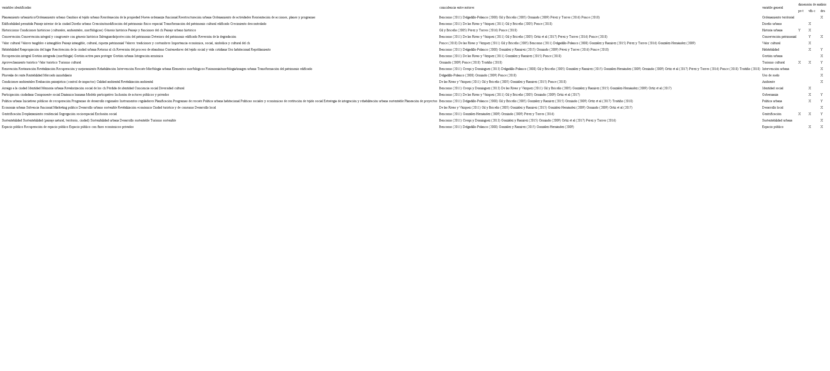 Se emplearon diversos criterios para la selección de las fuentes documentales; la principal consistió en buscar casos de estudio relacionados con ch tanto en el contexto internacional como iberoamericano. Se identificaron al respecto treinta artículos, publicados en revistas indexadas, que toman como objeto de estudio los Centros Históricos de Orihuela Alicante, Morella Castellón y Ciudad Vieja Salamanca, España; Mérida, Venezuela; Salvador de Bahía, Brasil; Ciudad de México, Puebla, Mérida, Zacatecas y Guanajuato, México. Posteriormente se llevó a cabo una selección de acuerdo con la temática de cada una de las investigaciones. Se identificaron diez casos de estudio como principales fuentes de investigación, la mayoría referentes a sitios reconocidos en la lista de Patrimonio Cultural de la Humanidad de la Unesco, los cuales abordan tópicos como paisaje urbano histórico, intervención sobre la imagen urbana en centros tradicionales, espacio patrimonial, espacio de rentas urbanas, iniciativas públicas de recuperación, turismo cultural y el marketing político, gestión urbana y participación, políticas urbanas de recuperación del patrimonio, turismo sustentable, rehabilitación urbana sostenible, usos y usuarios, revalorización social de los cascos históricos, ciudad colonial para turistas y consumidores, entre otros, que permitieron identificar las variables para el análisis de esta investigación. Asimismo, se elaboró una matriz en la que se agruparon las variables identificadas y se distribuyeron entre las siguientes tres dimensiones de análisis: procesos espacio-temporales (pe-t), valoración del legado histórico-cultural (vlh-c) y dinámica de la realidad urbana (dru) (Tabla 1).