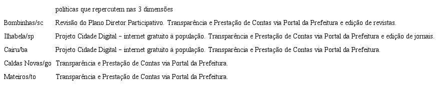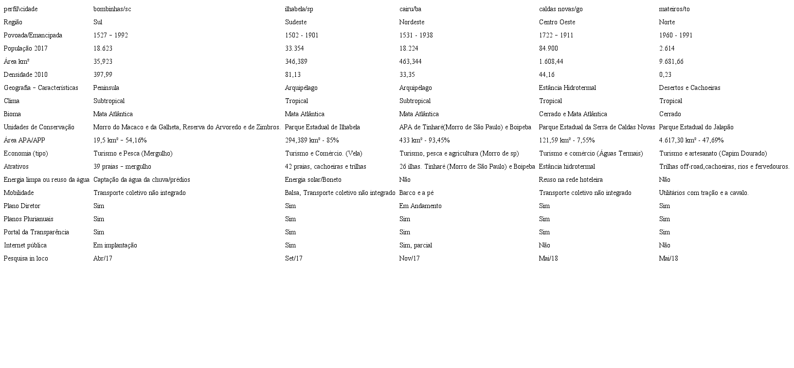 Verifica-se na Tabela 1, que todas as cidades foram emancipadas nos anos de 1900, porem Bombinhas, Ilhabela e Cairu são povoadas desde os anos de 1500. A população, a área e a densidade são diversas, mas o clima destas cidades é tropical a subtropical. O bioma de cerrado de Mateiros se distingue das demais, que possuem mata atlântica. As cinco cidades possuem unidades de conservação, as ações para o uso de energia limpa são incipientes em todas as cidades, bem como o sistema de mobilidade acentuado pelas peculiaridades de acesso a cada cidade. Todas as prefeituras mantem portais da transparência, com demonstrativos de contas e atos públicos e plano diretor participativo, implantados ou em andamento.