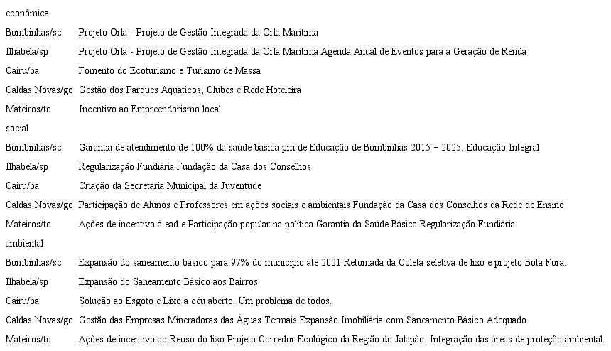 Observa-se no levantamento de políticas e ações sustentáveis relacionadas às dimensões econômica, social e ambiental, que a prioridade da sociedade e da gestão pública se concentra na geração de receitas.