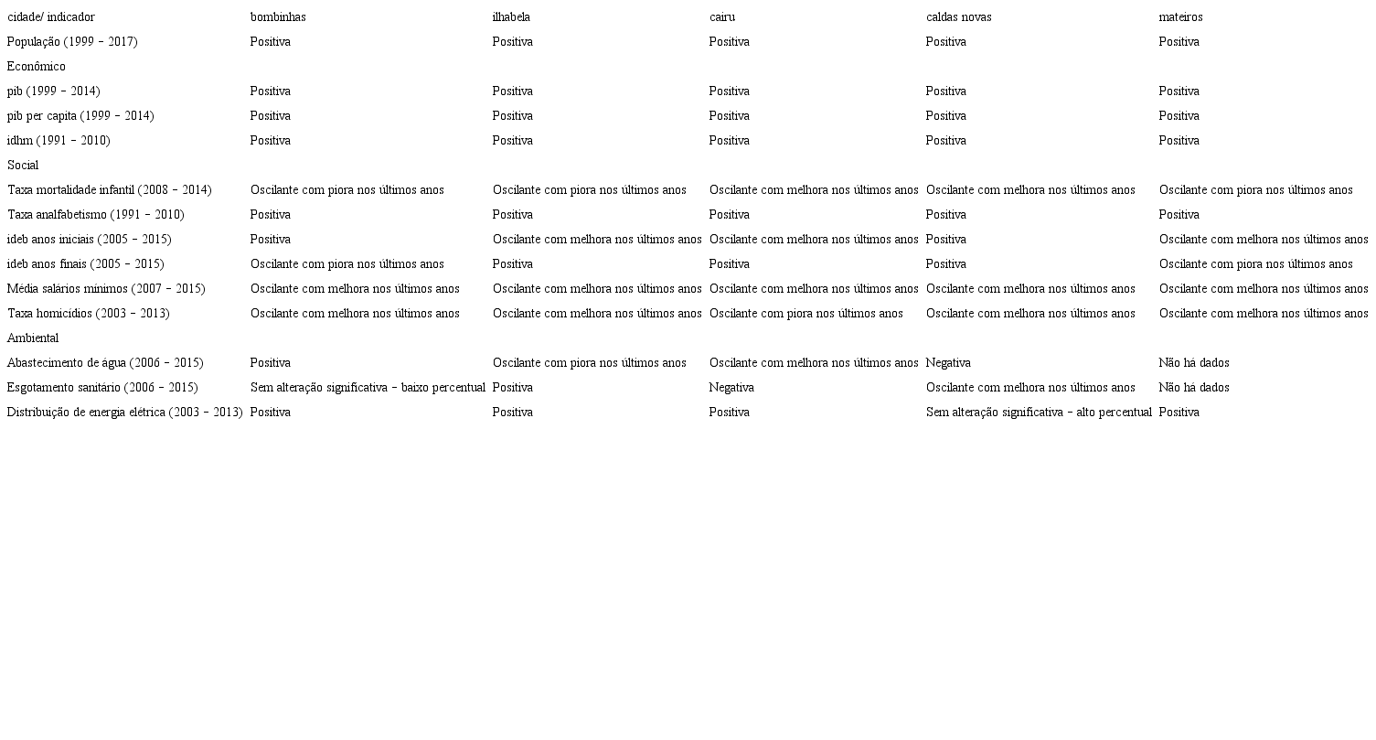 A Tabela 4 sintetiza os resultados obtidos dos gráficos de dispersão que analisaram a evolução temporal de indicadores relacionados a dimensão econômica, social e ambiental das cidades da amostra, que demonstraram ter, em menor ou maior grau, gestões participativas e práticas de governança implantadas. O objetivo é avaliar o efeito destas práticas no desenvolvimento sustentável das cidades. Para tal, a evolução temporal foi classificada em positiva ou negativa, oscilante com melhora ou piora.
