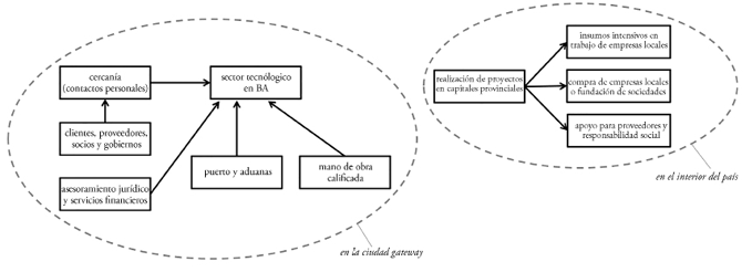 Como se demuestra a continuación, mucha de la cooperación entre las empresas clave del sector se realiza en Buenos Aires. El “acoplamiento estratégico” con empresas del interior ofrece oportunidades limitadas para el desarrollo en ubicaciones periféricas, también debido a la concentración de poder en Buenos Aires. Por lo tanto, la segunda contribución del artículo es demostrar que las ciudades compuertas tienen un rol decisivo para el acoplamiento estratégico. De este rol depende la medida en que las ubicaciones periféricas se benefician de la integración en la economía mundial.