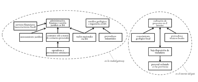 Con respecto al acoplamiento estratégico, las ubicaciones periféricas –donde las sedes secundarias de las empresas líderes se encargan de la ejecución de proyectos– se benefician del sector petrolero porque le prestan mano de obra y, a través de las pymes, le suministran productos y servicios. Los últimos son de baja complejidad técnica. La mano de obra no es calificada. En otras palabras, el acoplamiento estratégico se concentra en los factores de producción de bajo valor agregado, que son incorporados en las redes de producción por los inversores no locales. Las empresas locales tienen un rol subordinado, siendo subcontratistas de un segundo anillo de proveedores, lo que implica pocas perspectivas de diversificar sus actividades e independizarse. Más allá de los problemas enfrentados por las pymes en general, la concentración de poder en la ciudad compuerta desempeña un rol importante para los límites del desarrollo periférico. Si todo se maneja en Buenos Aires, las actividades intensivas en conocimiento y altamente ligadas a la captura de valor no se van a expandir hacia la periferia.