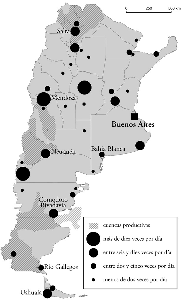 Otros interlocutores se refirieron a la importancia de Buenos Aires para el transporte aéreo y marítimo, es decir, el primer elemento de las ciudades compuertas (Entrevistas 1, 6, 10, 11). La Figura 3 ilustra que Buenos Aires, con los aeropuertos de Aeroparque y Ezeiza, es el nodo para vuelos nacionales. Hay pocas conexiones directas entre las provincias. Se puede viajar una vez por día de manera directa entre Comodoro Rivadavia, Mendoza y Neuquén –las ciudades más importantes para las empresas de petróleo y gas debido a su cercanía a las áreas de extracción–. Córdoba, que no tiene relevancia para el sector petrolero, es el aeropuerto del interior más conectado, con un vuelo cada día (o a veces, cada dos días) a trece destinos argentinos. Dado que la mayoría de las empresas en el sector petrolero trabaja en diferentes partes del país –en particular en las provincias de Chubut, Mendoza, Neuquén y Santa Cruz–, tiene sentido elegir Buenos Aires como sede central por razones logísticas (Entrevistas 3, 7). Dos entrevistados explicaron que todo lo que se necesita en lugares diferentes se centraliza en Buenos Aires (Entrevistas 5, 8). Esto es aún más cierto con respecto a vuelos internacionales. El aeropuerto de Ezeiza está bien conectado con las Américas y Europa. En algunos casos, hay vuelos internacionales desde otros aeropuertos argentinos (Córdoba, Mendoza y Rosario), cuyos destinos se limitan a Ciudad de Panamá y Sudamérica, especialmente a destinos turísticos en Brasil.