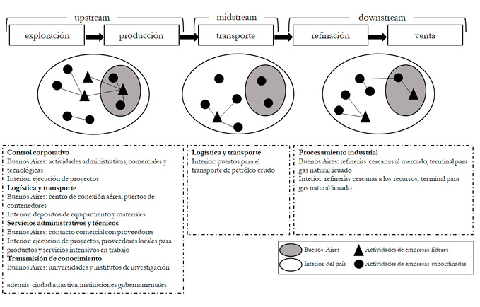 Este artículo se ha enfocado en el rol de Buenos Aires como ciudad compuerta del sector petrolero. Sobre todo, la concentración de sedes corporativas (clientes, socios y proveedores), así como el gobierno e instituciones públicas, explican la relevancia de Buenos Aires. Debido a esta densidad de actores clave, en su mayoría las empresas grandes tienen allí la gestión administrativa y comercial de sus actividades. En otras palabras, Buenos Aires es el lugar donde se organiza el acoplamiento estratégico, cuya implementación acontece en el interior. Transporte y logística, y también la transmisión de conocimiento, son factores importantes para la ciudad compuerta, salvo algunas restricciones. El procesamiento industrial, por el contrario, no es una característica relevante, por los menos en relación con las redes de producción petrolera: hay refinerías en el área metropolitana de Buenos Aires, pero también más cerca de los recursos. Los proveedores industriales están representados con oficinas en Buenos Aires. Ejecutan el trabajo en las provincias debido a las largas distancias, el coste de transporte y las leyes de contenido local.