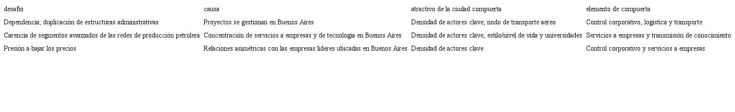 En resumen, el papel de Buenos Aires y del interior del país para el sector del petróleo y gas se muestra en la Figura 4. La Tabla 1 da una visión conjunta de los desafíos que enfrentan ciertos lugares periféricos en relación con el rol dominante de la ciudad compuerta. No se debe malinterpretar: algunas funciones de compuerta se han descentralizado, permitiendo la provisión de servicios genéricos en lugares cercanos a los yacimientos, y el desarrollo de las industrias petroquímicas y la logística en Bahía Blanca. En otras palabras, la integración en la economía mundial a través de las ciudades compuertas tiene ventajas e inconvenientes para la periferia. Además, hay desafíos que no son consecuencia de que Buenos Aires sea una ciudad atractiva para muchas actividades del sector petrolero, como la subcontratación de empresas locales, la tercerización de mano de obra y los problemas típicos de las pymes. Es decir, las ciudades compuertas son solo un factor entre varios que influyen en el desarrollo del interior, pero el presente artículo demuestra que este factor tiene una relevancia considerable que merece más atención en debates académicos y políticos.