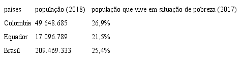 Cabe assinalar que o Brasil em 2017 teve 22,9% de sua população com renda per capta inferior a 50% da média, segundo o Panorama Social da América Latina 2018 da cepal. Dados do Instituto Brasileiro de Geografia e Estatística – ibge (2017) confirmam que a pobreza está regionalmente localizada no Brasil. No Sul do país 12,8% da população está abaixo da linha da pobreza definida pelo Banco Mundial (linha de corte de US$ 5,50 por dia por pessoa), vivendo com menos de R$406,00/mês (quatrocentos e seis reais/ mês) o equivalente a US$ 101,00/mês (cento e um dólar/ mês) (tabela 1).