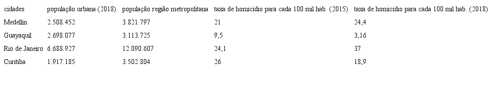 As cidades selecionadas para este estudo foram: Medellín (Colômbia), Guayaquil (Equador), Rio de Janeiro e Curitiba (Brasil). O critério de seleção respaldou-se em políticas públicas aplicadas a este fenômeno urbano que, em alguns casos, tem apresentado melhoras significativas e, em outros, severos transtornos e anomalias urbanas particulares dentro da convivência social dessas urbes. Para isso, foi utilizada como parâmetro indicativo a taxa de homicídios para cada 100 mil habitantes, reconhecida pela comunidade internacional como o principal indicador para medir o estado de segurança em cidades e países. Salienta-se a importância desse indicador como chave para a compreensão da gravidade da problemática por ser vinculado diretamente com “o risco de perder o principal bem jurídico que o Estado deve proteger: o direito humano à vida” (Srur, 2013, p. 5).
