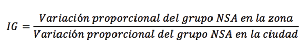 Definimos empíricamente la gentrificación como la llegada de nuevos hogares nsa a una determinada zona, lo que supone una intensificación de la competencia por el espacio con los hogares de nsb originarios, más el potencial desplazamiento de estos últimos. En este trabajo asumimos que hubo algún grado de gentrificación allí donde la cantidad de hogares nsa aumentó por encima de la media urbana, independientemente de si hubo o no desplazamientos, de si existe una renovación urbana en términos de inversión pública o privada en el mejoramiento físico y ambiental, o de si están presentes otros atributos típicamente asociados a la gentrificación, como la centralidad o el aumento en los precios del suelo (Marcuse, 1985). El índice de gentrificación (ig) se define, entonces, como la variación del grupo nsa en la zona, dividido por la variación del grupo en la ciudad.