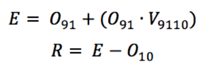 La cantidad de relocalizaciones (R) de un grupo puede aproximarse como la diferencia entre la cantidad de hogares observada (O) en 2010 y la cantidad esperada (E) en el mismo año, si el grupo hubiese registrado la misma variación proporcional (V) que en la ciudad durante el periodo:
