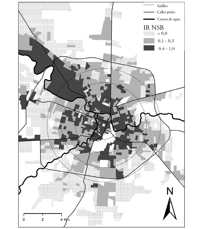 En el área central y anillos 1 y 2, tanto el grupo nsb como el nsa presentan valores positivos en el ir, es decir, existen menos hogares de los que cabría esperar en relación con su variación en el conjunto de la ciudad. Esto sugiere que en ambos grupos hubo un saldo neto de hogares que cambiaron su lugar de residencia alejándose del centro. Existen, sin embargo, diferencias sustantivas de acuerdo al nivel socioeconómico.