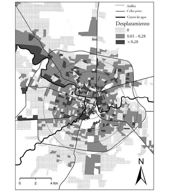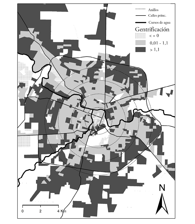 Finalmente, la Figura 4 muestra dónde se localizan los radios censales con diferente intensidad de gentrificación, definida empíricamente como la llegada significativa de nuevos hogares nsa a una zona determinada. Se puede ver a simple vista una distribución con valores altos en la periferia y tercer anillo –mayormente nuevas urbanizaciones–, pero también en algunas zonas puntuales del centro y anillos interiores, correspondientes a la ciudad consolidada.