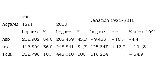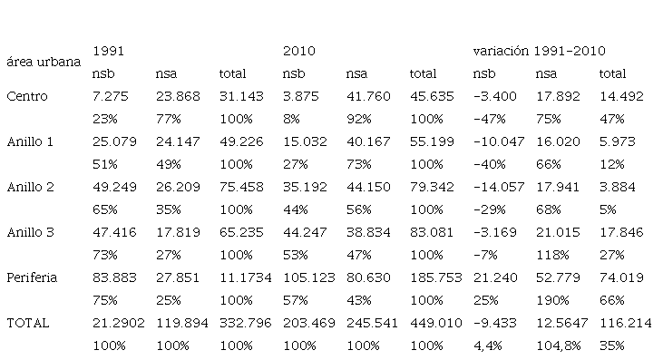 La densificación del área central tuvo como protagonistas a los hogares de mayor nivel socioeconómico, existiendo en 2010 un 75% más de hogares nsa respecto a 1991. Los hogares nsb, en cambio, no solo se redujeron en cantidad (-3.400), sino extraordinariamente por encima de la media urbana (47% frente a 4,4%, respectivamente).7 Algo similar sucede en las áreas pericentrales 1 y 2, con una reducción de hogares nsb por encima de la media urbana, y un importante aumento de hogares nsa, aunque por debajo de la media. Es recién en la periferia donde ambos grupos crecen muy por encima de la media urbana.