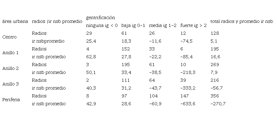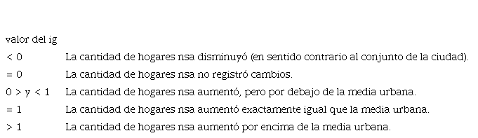 Ahora bien, si el ir del grupo nsb resulta ser positivo y mayor al del grupo nsa, esto puede interpretarse como que el grupo nsb tuvo mayores restricciones económicas para permanecer. El saldo positivo entre el ir del grupo nsb y el del grupo nsa puede ser considerado un indicador de la intensidad relativa de los desplazamientos (relocalizaciones económicamente condicionadas) en diferentes zonas de la ciudad.6