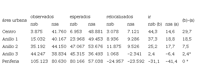 La Tabla 4 muestra los valores del índice de relocalización (ir) para ambos grupos socioeconómicos según la distancia al centro. Hemos asumido que no existirían desplazamientos (relocalizaciones económicamente condicionadas) si ambos grupos presentaran el mismo ir; es decir, si la probabilidad de habitar en o cerca del centro fuese la misma para todos los hogares con independencia del nivel socioeconómico.