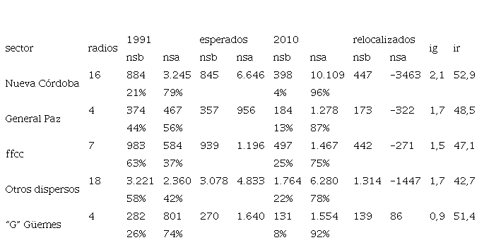 En cuanto a su composición socioeconómica, el sector “g” del barrio Güemes presentaba un panorama bastante similar al sector de Nueva Córdoba (con el cual limita al este) tanto en 1991 como en 2010, y también un alto índice de posibles desplazamientos (ir 51,4%). Nótese que, sin embargo, el ig es de apenas 0,9 en este sector, escasamente por debajo de la media urbana, pero muy por debajo de los sectores previos. En el caso de este sector del barrio Güemes, los desplazamientos no aparecen, entonces, relacionados con la llegada de grupos de mayor nivel socioeconómico. Se podría conjeturar que ha sido otro tipo de gentrificación, más bien comercial y turística (que modificó el perfil del barrio en las últimas décadas, orientado a consumidores de mayor poder adquisitivo), lo que ha inducido a los desplazamientos, producto de un posible aumento en el precio del suelo. Otra posibilidad es que las dos décadas analizadas nos estén mostrando apenas un fragmento de un proceso de más largo plazo, donde la llegada masiva de clases medias y altas al barrio se produjo con anterioridad a la década de los noventa, y posteriormente se tradujo en masivos desplazamientos. Lamentablemente no estamos en condiciones de examinar esta hipótesis, dado que no existen los datos necesarios.