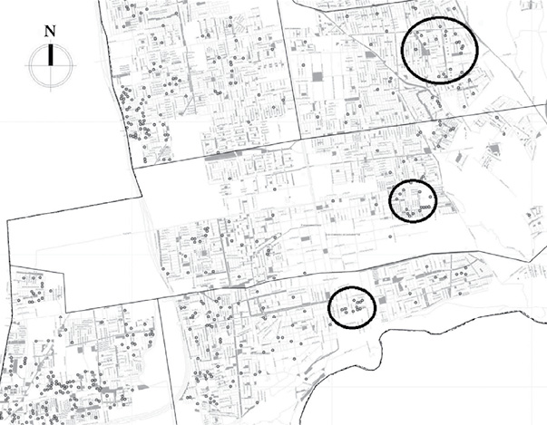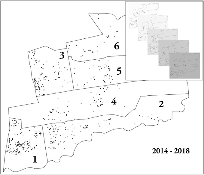 De esta forma, la ubicación domiciliaria de cada joven considerado en la muestra ha sido localizada en el plano comunal, sectorizada y asociada a una villa o población, y ha sido representada por un punto en el sistema sig (Sistema de Información Geográfica) utilizando el software qgis. De este modo, se han generado planos anuales y una compilación final. El objetivo que guía este despliegue de datos es iniciar de forma incipiente una descripción de la concentración y sectorización de áreas con mayor presencia de residentes sancionados por la justicia penal juvenil. La importancia de seleccionar la comuna de Puente Alto es que se trata de un distrito considerado emblemáticamente vinculado a niveles especialmente preocupantes de pobreza, delincuencia y estigmatización, en particular de su población juvenil, con presencia recurrente en coberturas de prensa relacionadas a estas problemáticas (Figura 4).