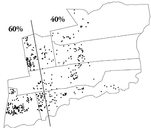 Tal como se observa en la Figura 5, el eje conformado por la avenida Ejército Libertador constituye un límite que divide la comuna en un sector poniente, claramente vinculado con una mayor incidencia de problemáticas sociales, incluida una significativa presencia de jóvenes infractores de ley; y un sector oriente, donde la ubicación de los jóvenes infractores no resulta tan marcadamente concentrada. En lo concreto, desde el eje Ejército Libertador al poniente se contabilizan 297 de los 500 casos referenciados, con lo que un segmento territorialmente minoritario de la comuna concentra prácticamente el 60% de los casos.