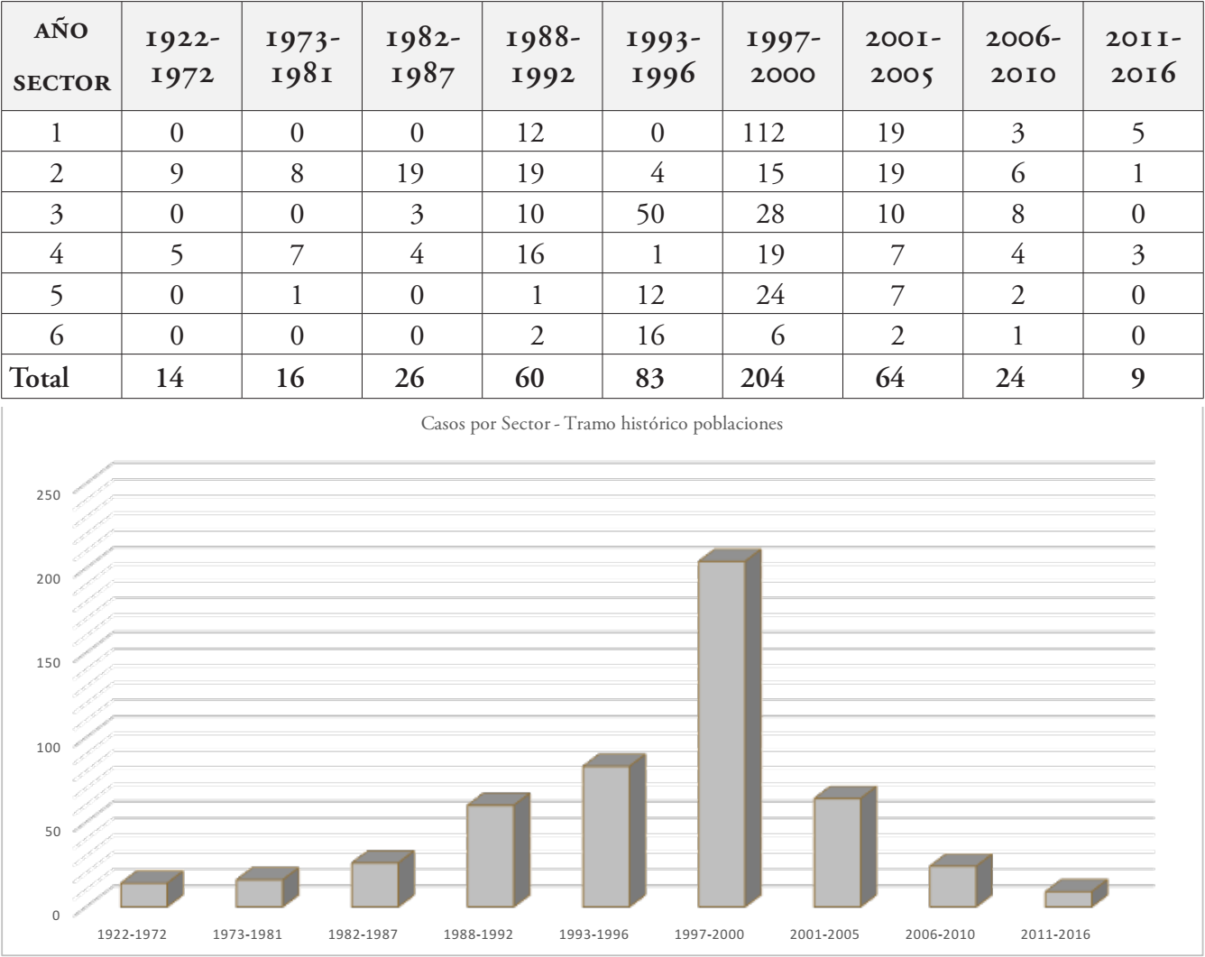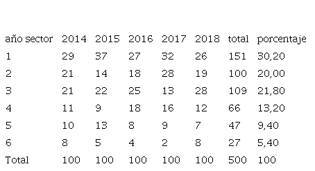 Es posible detallar la información desagregada del número de casos por sector según se establece en la Tabla 1, cuyas cifras arrojan una distribución porcentual altamente irregular de la muestra, fijada en 100 casos por año.