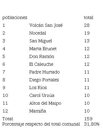 Pese a que no pertenecen a zonas con una escala de problemáticas sociales masificada y a tener un mayor acceso a servicios (colegios, centros de salud, vigilancia, conectividad, etc.), se trata de poblaciones con dinámicas internas que incluyen componentes prodelictuales (pandillas, tráfico de drogas, violencia familiar y vecinal, entre otras), quedando aisladas de su entorno directo. No se descarta en ellas, además, la acción de fenómenos de estigmatización, segregación urbana y problemas en el proceso de poblamiento; por ejemplo, conflictos ocasionados por la proveniencia de pobladores desde distintos campamentos, los que debían convivir en la misma población e iniciaron escaladas de violencia interna (Pérez, 2012, p. 47), como se ha documentado para la Población Carol Urzúa.