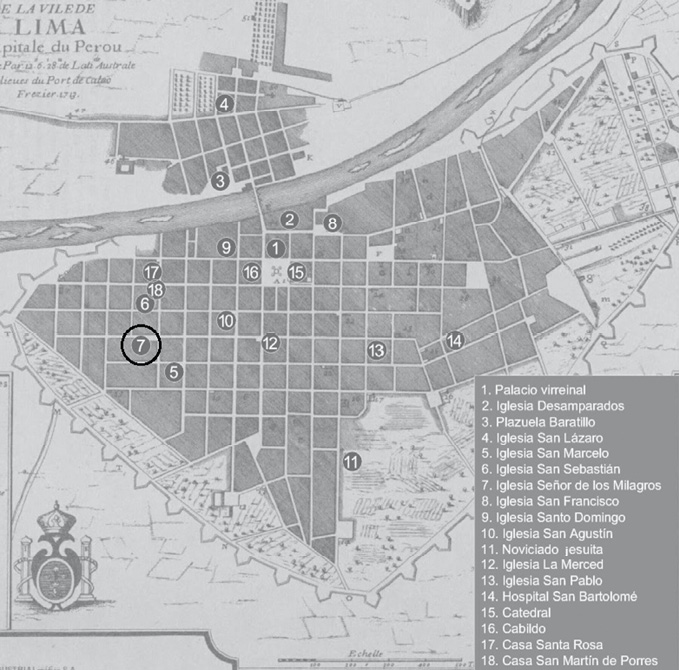 Pasaron los años y, en 1670, el residente Antonio León comenzó a adorar la imagen, luego de que le atribuyera la curación de una enfermedad grave (tumor). El culto se reactivó aún más, especialmente entre la gente de color, quienes “el viernes por la noche (…) se juntaban en bulliciosas celebraciones” (Rostworowski, 1992, p. 6). Las peregrinaciones a este lugar fueron intensificándose y se incorporaron prácticas como plegarias y lamentaciones, acompañadas de instrumentos musicales como cajas, vihuelas y arpas. A ello se sumó la práctica de rituales y danzas no cristianas asociadas a las deidades africanas tradicionales Zanajarí o Nyamatsané, a través de las cuales veneraban al Cristo de Pachacamilla (Banchero Castellano, 1976, p. 20; en Costilla, 2011, p. 8). Y aunque Pachacamilla era un barrio considerado marginal, estaba situado a menos de un kilómetro de la plaza mayor y de los palacios virreinal y arzobispal de Lima (Figura 1).