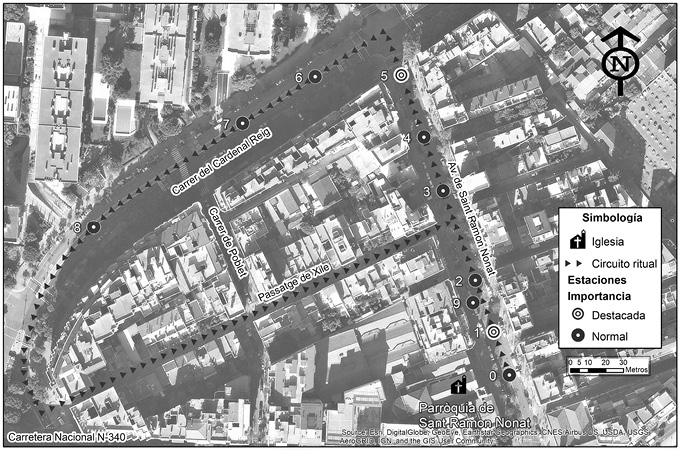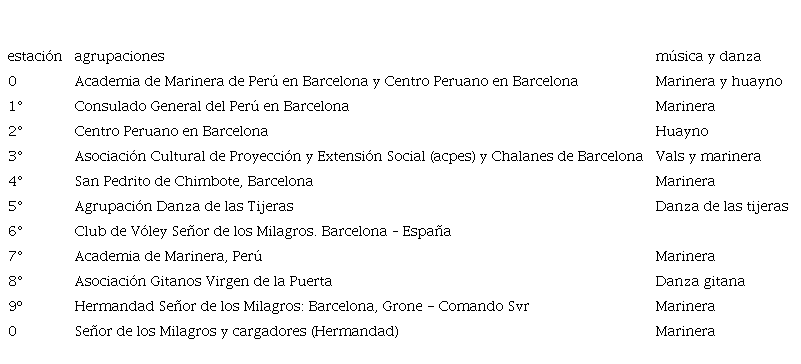 Durante la celebración del Señor de los Milagros en 2016, esta danza fue representada en la estación que organizan sus ejecutores en la intersección de la avenida Sant Ramon Nonat y la calle del Cardenal Reig (Figura 2). Se trata de una estación peculiar, por diversos motivos: i) está ubicada en una intersección, siendo la avenida el centro neurálgico de la celebración (donde se danza la marinera), mientras que la calle solo está parcialmente cortada al tráfico; ii) es considerada más un espectáculo que una parte esencial de la celebración, al no incluir mayores referencias simbólicas a la unidad como hermanos peruanos o devotos durante la danza (como ocurre con la entonación del himno del Perú o el himno del Señor de los Milagros); y iii) se aprecian claros signos de molestia por parte de los cargadores al no desplegarse la soga frente a ellos, desapareciendo consecuentemente la idea de construcción de un escenario (vía la soga) en el que se interactúa con la imagen del Cristo Moreno. Además, en la ocasión, solo pasada esta estación las mujeres devotas pudieron cargar la imagen del Cristo.