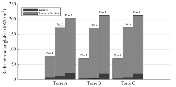 En la Figura 9 se observa que, en el periodo de simulación, existen diferencias importantes en la exposición solar en la fachada norte entre los edificios que cumplen con la rasante y los creados siguiendo el criterio de las Líneas de Sección. Estas diferencias se observan principalmente en los primeros pisos. En promedio, el primer piso de los edificios creados con la rasante recibe un 5,83% del aporte solar que reciben los edificios creados con las Líneas de Sección; el segundo piso recibe en promedio el 3,96% y el tercero, un 10%. Por otro lado, aquellos edificios creados aplicando el criterio de la rasante generan grandes zonas de sombreamiento sobre las edificaciones cercanas, en las cuales se ve disminuido el acceso solar de los primeros pisos. Una disminución en el acceso solar se traduce en un menor aporte energético en los meses de invierno, lo que incrementa la demanda de calefacción e iluminación de las torres afectadas.