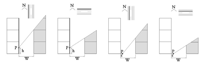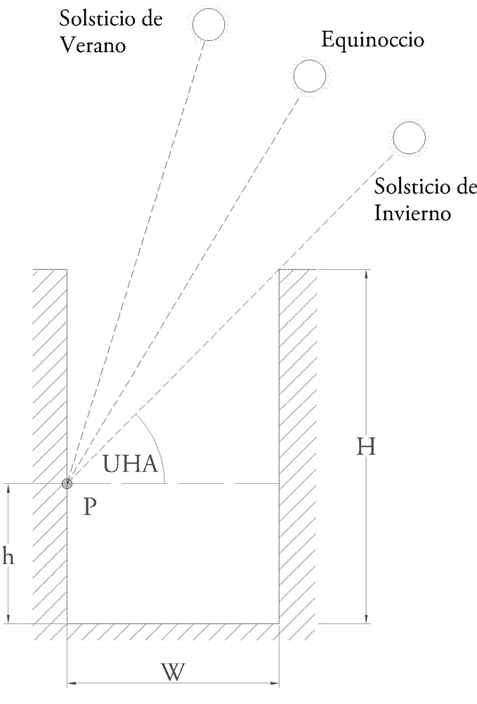 Capeluto, Yezioro, Bleiberg y Shaviv (2005) describen una herramienta de diseño para el aseguramiento de acceso solar basada en el concepto de envolvente solar, denominada Líneas de Sección. Estas líneas representan el ángulo de la posición del sol sobre el horizonte más bajo para un espacio de tiempo requerido y están relacionadas con el concepto de Ángulo de Horizonte Urbano (uha, por sus siglas en inglés) de un cañón urbano (Figura 1). El uha es el ángulo subtendido desde una altura h, hasta la cima de los edificios contrarios (h), separados por una calle de ancho W. La Línea de Sección corresponde al uha que permite el acceso directo del sol hasta el punto P durante un periodo para un día determinado; por lo tanto, define la altura de los edificios contrarios para satisfacer tal restricción.