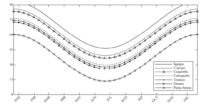 La Figura 3 muestra la variación del ángulo de elevación del sol respecto de la horizontal en el mediodía solar (posición más alta en el cielo) durante el año, para las ciudades en estudio. A medida que aumenta la latitud (hacia el sur), la altura solar disminuye, lo que implica que mientras más al sur se emplace una vivienda, más restrictivo debe ser el ángulo de aseguramiento solar.