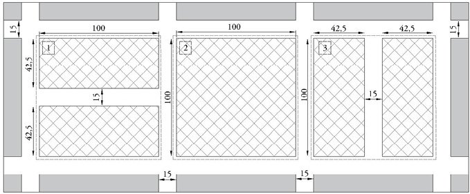 Para mostrar la aplicación de las Líneas de Sección en el contexto urbano, se ocupa como grilla urbana una manzana ortogonal de 100 x 100 metros orientada hacia el norte geográfico, con una separación entre líneas oficiales de 15 metros (distancia entre las caras de los edificios opuestos), que corresponde a una vía de servicio unidireccional descrita en el Artículo 2.3.4 de la oguc (minvu, 2018). Se presentará la envolvente solar formada por las Líneas de Sección en Concepción; para observar el efecto de la grilla urbana en el volumen de la envolvente solar, se consideran tres tipologías de tejido urbano (Figura 4). Las tipologías 1 y 3 de la Figura 4 corresponden a una grilla de 100 x 100 metros que es atravesada en el sentido horizontal y vertical, respectivamente, por una vía local de 15 metros, que las separa en dos predios de 100 x 42,5 metros.
