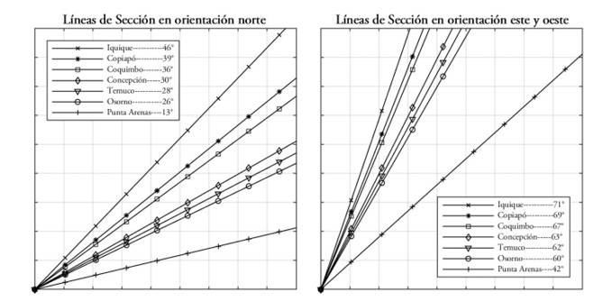 La Figura 5 muestra las Líneas de Sección que permiten asegurar una hora de acceso solar durante el solsticio de invierno en las orientaciones norte, este y oeste de las viviendas ubicadas en siete ciudades chilenas.