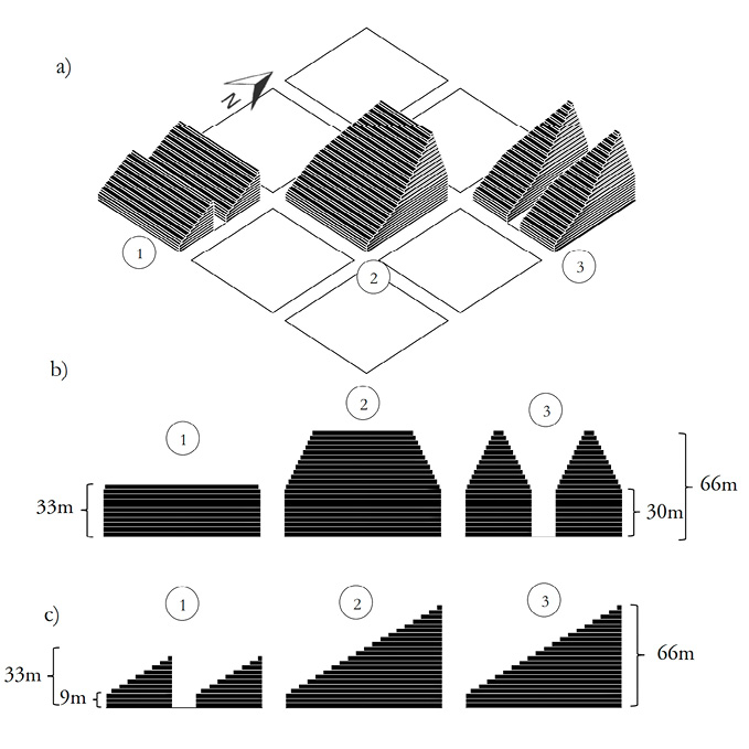 Las Líneas de Sección generan envolventes con geometrías escalonadas, que alcanzan una altura máxima de 66 metros en la zona norte de la grilla urbana. La forma de la grilla tiene un fuerte impacto en el volumen de la envolvente solar, ya que una grilla orientada de norte a sur (Envolvente 3 de la Figura 6) permite un volumen 39% mayor que la grilla orientada de este a oeste (Envolvente 1 de la Figura 6). Las tres tipologías mostradas en la Figura 6 presentan diferentes volúmenes de edificación, donde la tipología tipo 1 tiene un volumen total de 177.872 metros cúbicos. La tipología tipo 3 tiene un volumen 39% mayor a la tipología 1 y la tipología tipo 2 tiene un volumen 4% mayor a la tipología tipo 1. Por otro lado, al comparar el número de pisos de estas tipologías, encontramos que la tipología tipo 1 tiene 11 pisos, y que las tipologías tipo 2 y 3 tienen el mismo número de pisos, igual a 22.