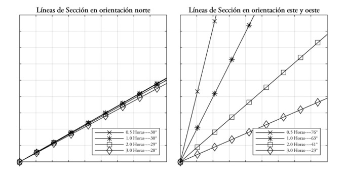 El ángulo de las Líneas de Sección de la Figura 5 está definido para permitir una hora de acceso solar; por lo tanto, será distinto para cualquier otro requerimiento. En la Figura 7 se presentan las Líneas de Sección para Concepción que aseguran 30 minutos, 1 hora, 2 horas y 3 horas de acceso solar.