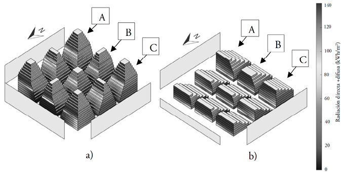 Se analizó la radiación solar global que incide sobre las fachadas de cada edificio. Para esto, se utilizó el código de simulación de energía solar urbes, que puede manejar grandes escenarios urbanos (Merino, 2013; Vermeulen, 2014; Wegertseder, Lund, Mikkola & García, 2016). Los datos de entrada principales del código urbes son de la morfología urbana sobre la cual se quiere determinar la radiación solar incidente y la latitud geográfica del lugar donde está emplazado el proyecto, ya que esta define el trayecto del sol durante el año. Para las simulaciones, se usó un modelo de radiación solar para días despejados (Liu & Jordan, 1960), lo que permite una ponderación real de las posiciones del sol a lo largo de un día específico, de modo que la radiación solar recibida al amanecer o atardecer tiene una menor influencia que la radiación recibida al mediodía (Vermeulen et al., 2018).
