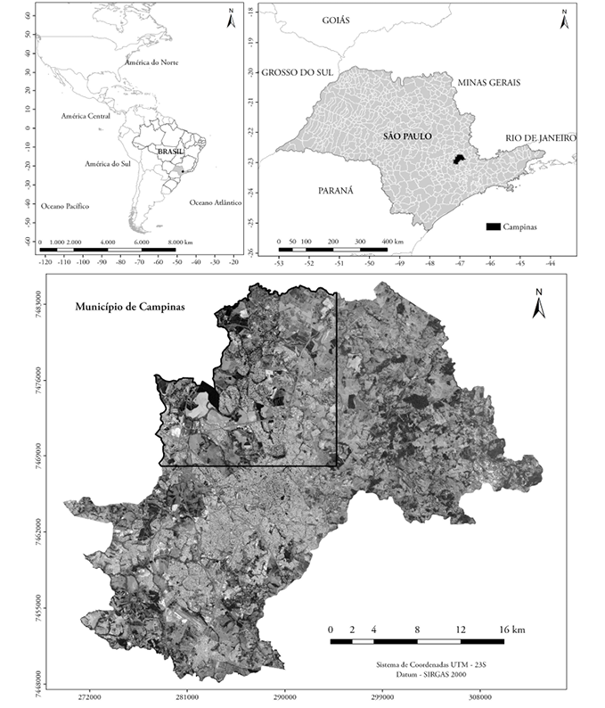 O município de Campinas se constitui em um polo industrial e tecnológico do estado de São Paulo (Figura 1), que nas últimas décadas se caracteriza pelo intenso processo de modernização dos setores industrial e agrícola, descritos para o cenário brasileiro (ibge, 2011). Principalmente, a partir de 1930, devido à transferência de investimento do setor agrícola para o da construção civil, que proporcionou à restruturação da infraestrutura de transporte. O parcelamento e melhorias de infraestrutura foram concentradas no núcleo urbano central, o que promoveu a valorização dessas áreas e, por consequência, o deslocamento da população para as áreas periféricas (Badaró, 1996). Campinas, em 2018, possuía população estimada de 1.194.094 habitantes. Todavia, as informações de densidade populacional e população urbana estão levantadas apenas pelo censo demográfico de 2010, que averiguou uma proporção de residentes em áreas urbanas de 98,3% e densidade demográfica de 2.520 hab/km² (ibge, 2011).