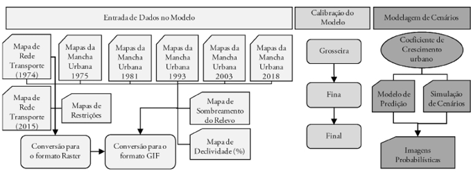 Em linhas gerais, a aplicação do Modelo de Crescimento Urbano de Clarke – sleuth requer a execução dos seguintes procedimentos: elaboração do banco de dados geográfico; conversão dos mapas para formato gif (Graphic Interchange Format); testes de calibração, modelagem de cenários de crescimento urbano e validação do cenário de predição para data atual (Clarke et al., 1997; Mahiny & Clarke, 2012; Silva & Clarke, 2002).